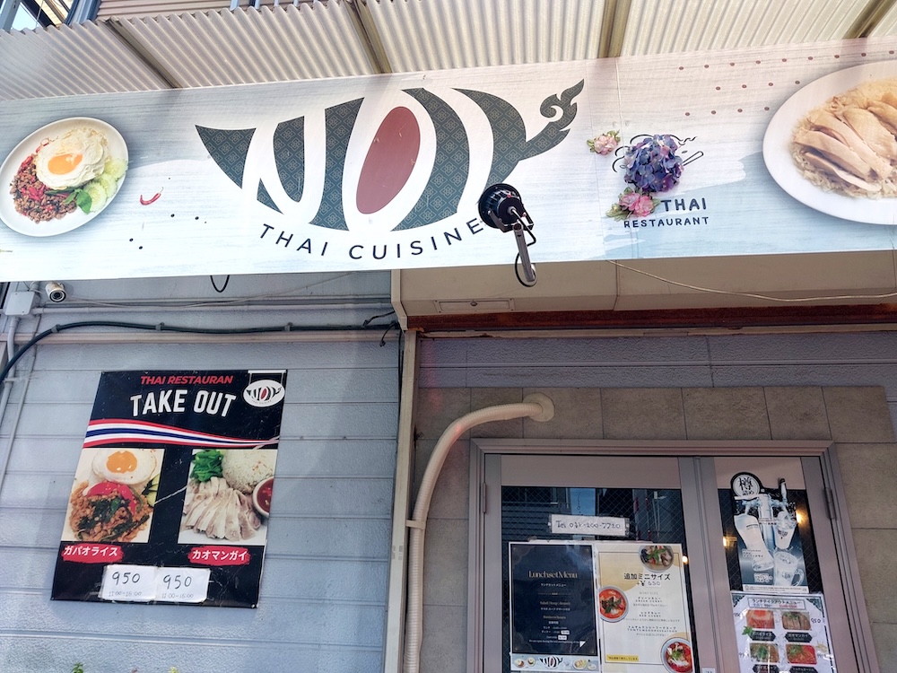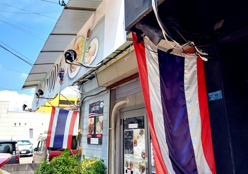おしゃれなロゴ入りの看板と、赤・白・紺の鮮やかなタイの国旗が目印です。