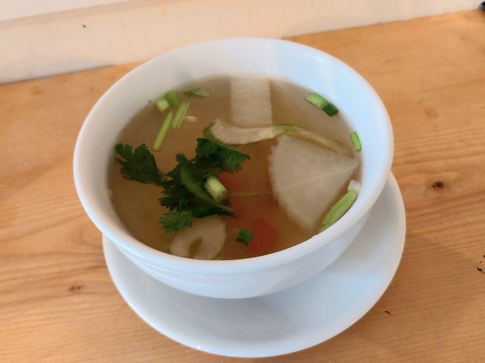チキンスープは、パクチーの爽やかな香りがふわりと広がり、鶏肉の旨みが溶け込んだ優しい味わいが体にしみわたります。