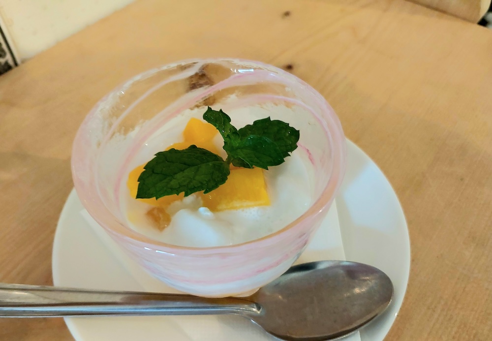食後の締めくくりは、見た目も美しいミニサイズのココナッツとマンゴーのゼリー。つるんとした喉ごしで、ココナッツの甘みとマンゴーの香りが口の中でやさしく広がり、満腹のはずが最後までおいしくいただきました。