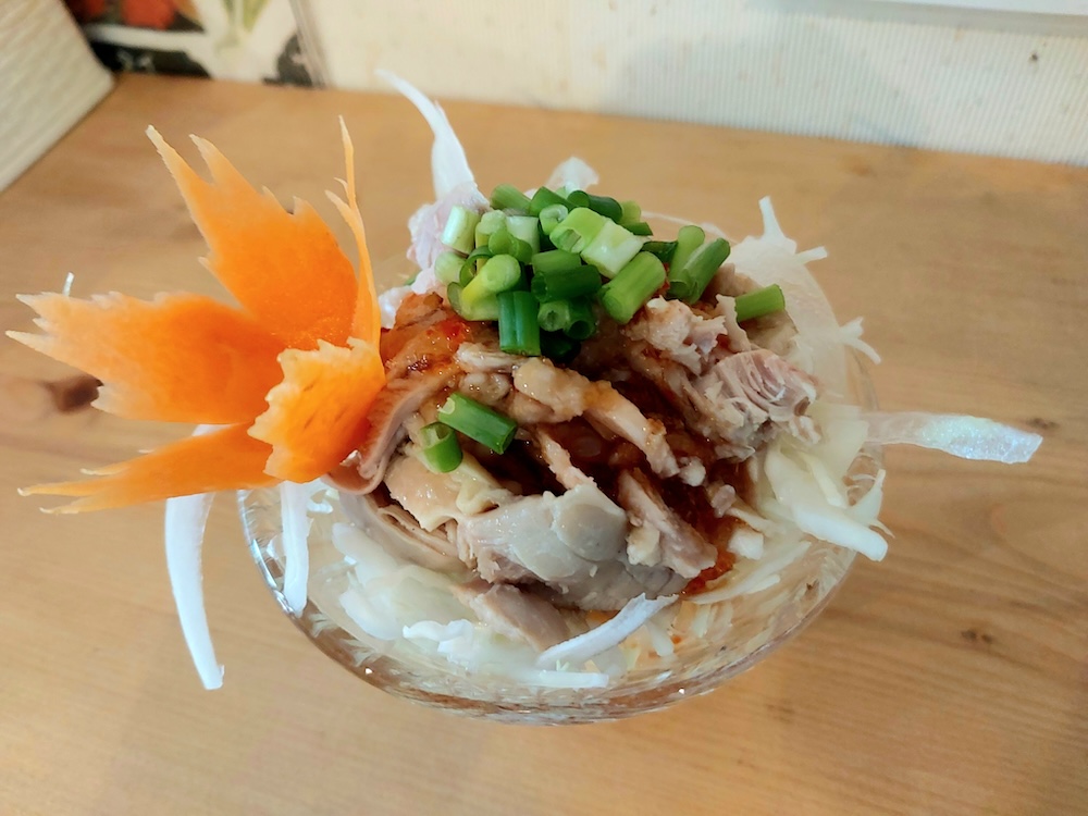 チキンサラダには、美しい飾り切りの人参が添えられ、見た目もとても華やか!やわらかいチキンとキャベツに、甘酸っぱいドレッシングがよく絡み、味のバランスも絶妙です。