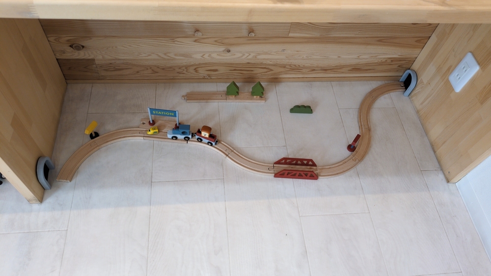 陳列棚の下にかわいいおもちゃレールを発見!
