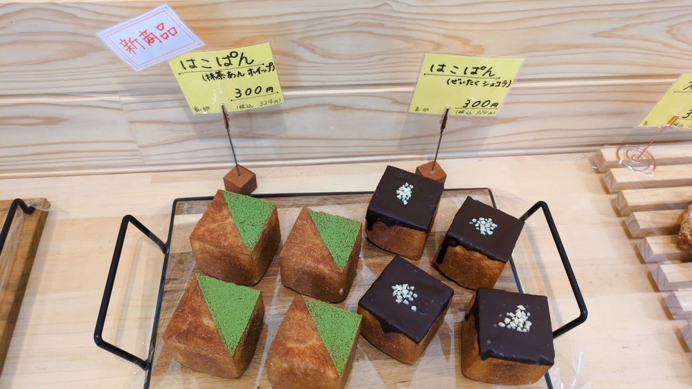 「はこパン」の名前の由来は、四角い箱のようなキューブ型のパンということだそうです。この日は、「抹茶あんホイップ」と「ぜいたくショコラ」の2つが並んでいました。
