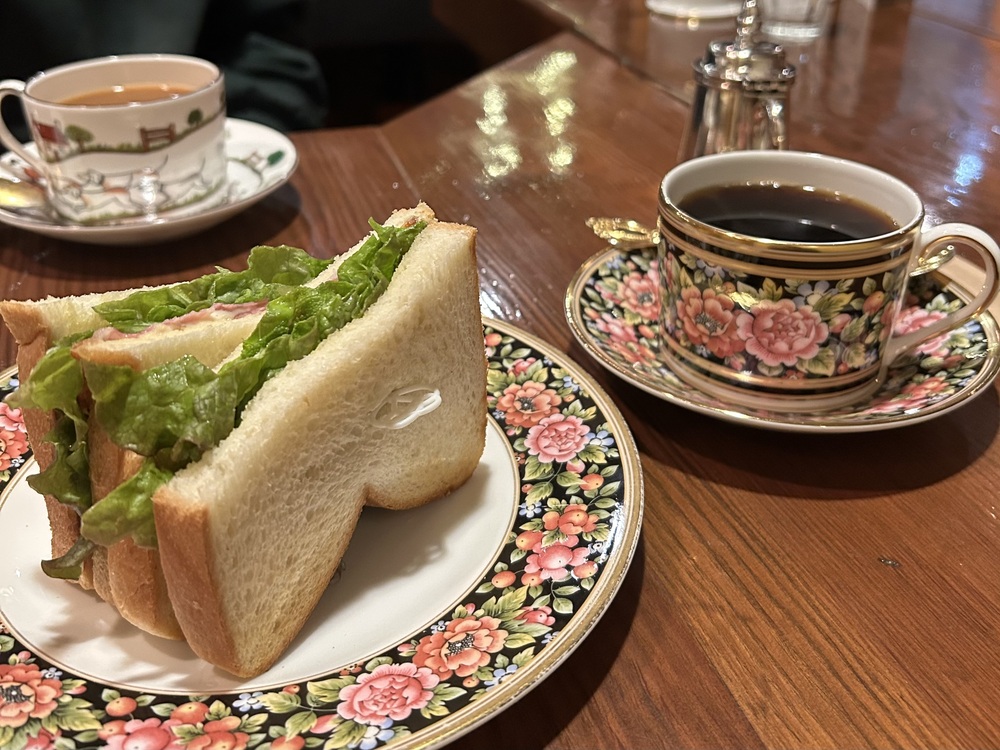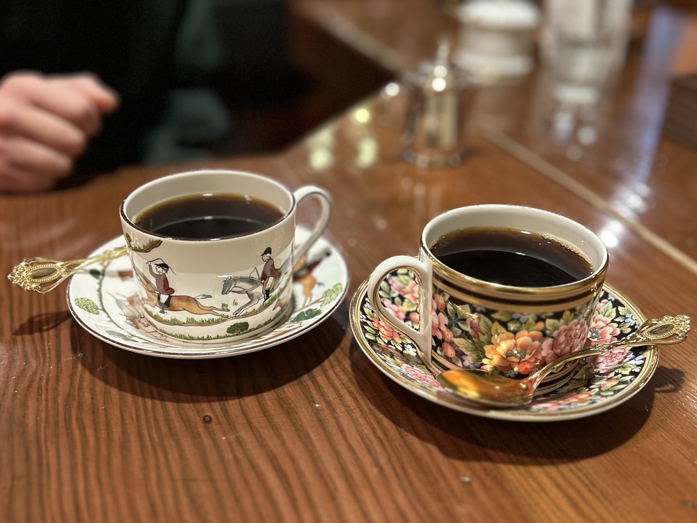 ティファニーブルーにゴールドの縁がかわいらしくも優美なカップに注がれた「バターブレンドカフェ」。苦味のないまろやかな味わいでした。
