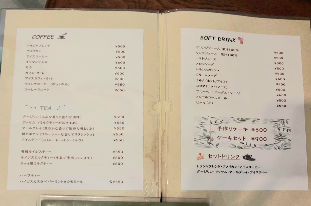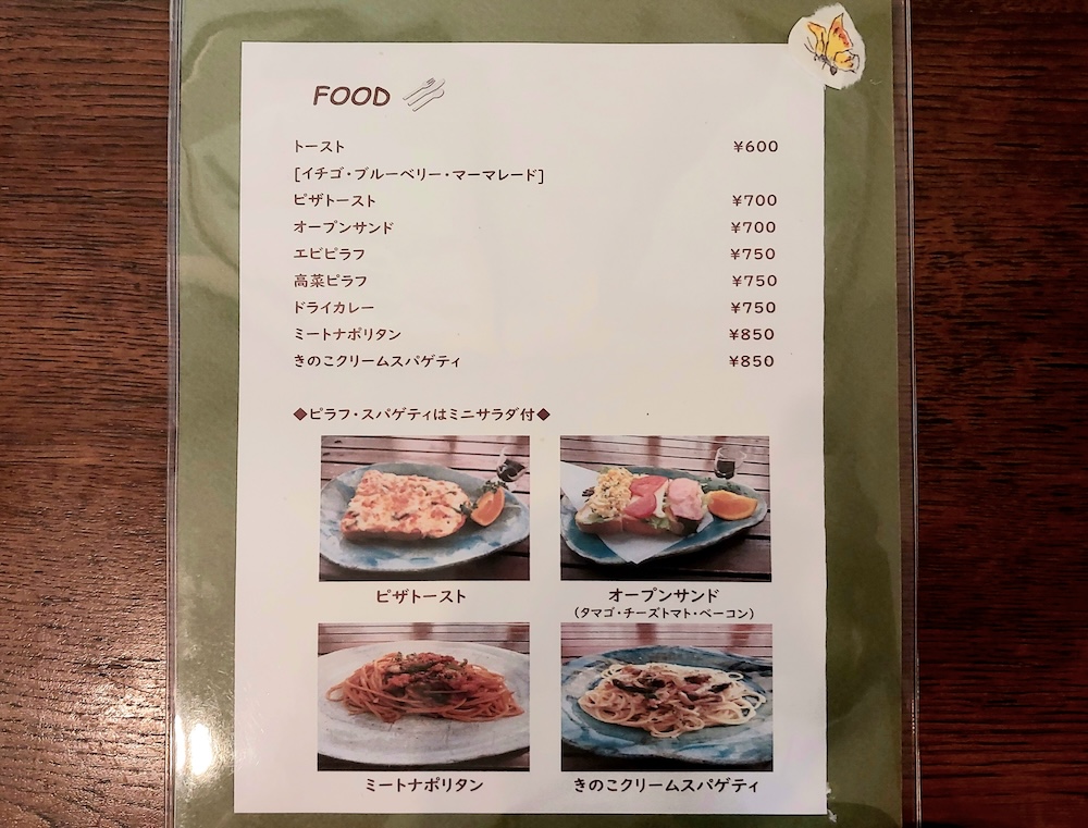 お食事のメニューは、トースト(600円)やオープンサンド(700円)、エビピラフ(750円)、ミートナポリタン(850円)など種類豊富。そしてどれもリーズナブルです!