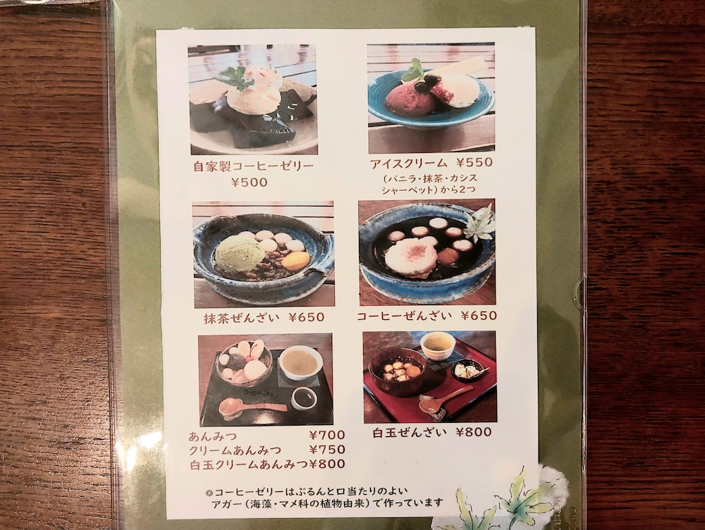 写真付きのデザートメニューはこちら。暑い時期にもぴったりの自家製コーヒーゼリー(500円)や、コーヒーぜんざい(650円)、白玉クリームあんみつ(800円)など甘味スイーツもおいしそうで、目移りしてしまいます。