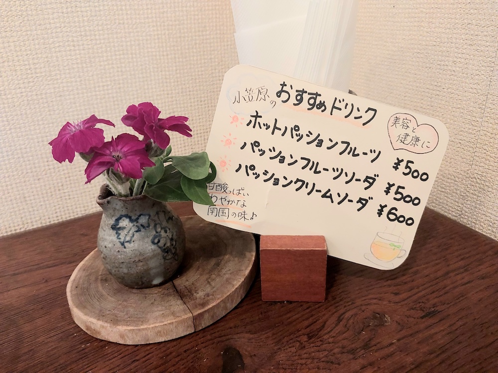 ドリンクメニューも、コーヒー、紅茶、ソフトドリンクといろいろと揃っています。おすすめドリンクの、甘酸っぱい南国の味を楽しめる、夏らしいパッションフルーツのドリンクにも惹かれてしまいました。