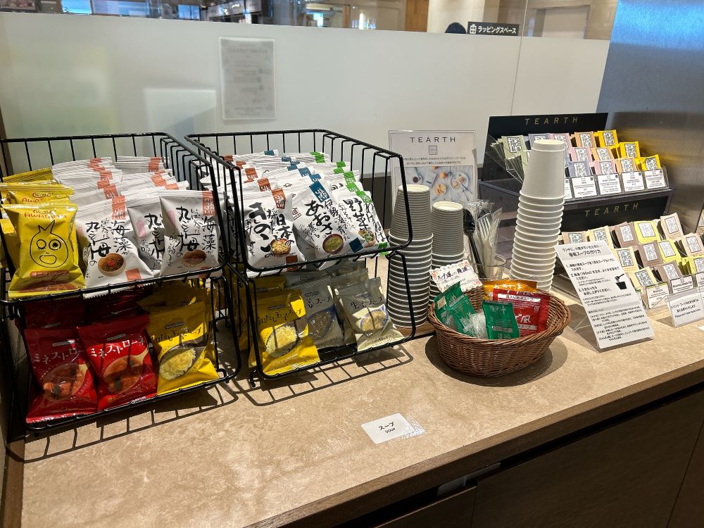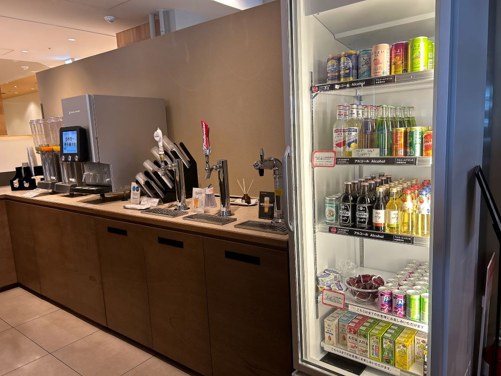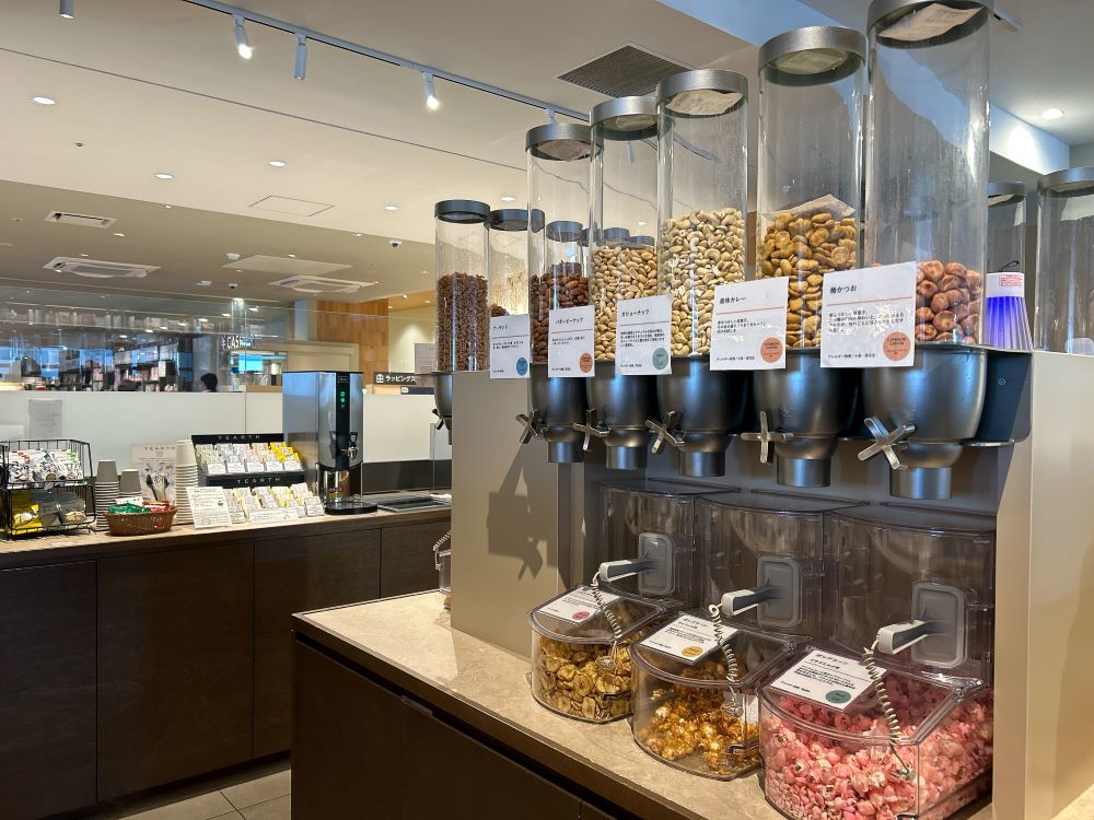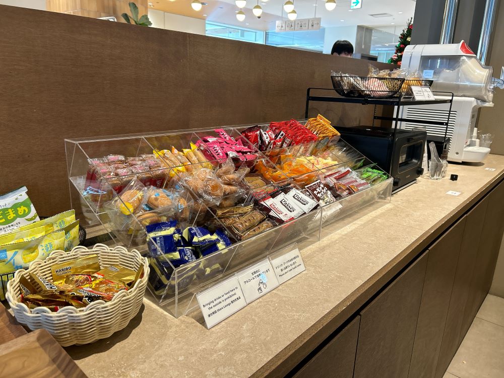 シェアラウンジでは、ドリンクやスナックがすべて自由に楽しめます。種類豊富で魅力的なものが多く、目移りしてしまいます。