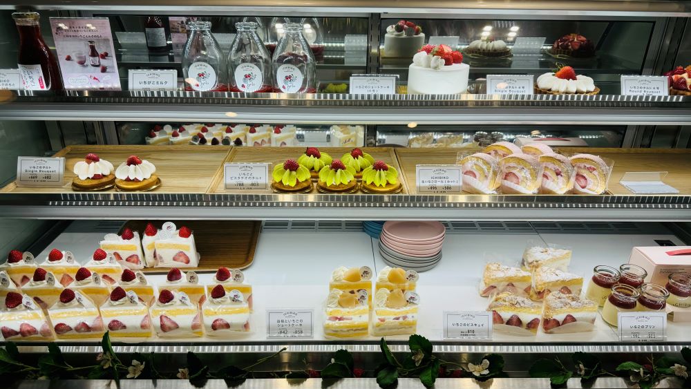 思わず目移りしてしまうバラエティ豊かな新鮮ないちごや旬のフルーツを取り入れたケーキがずらりと並んでいます。