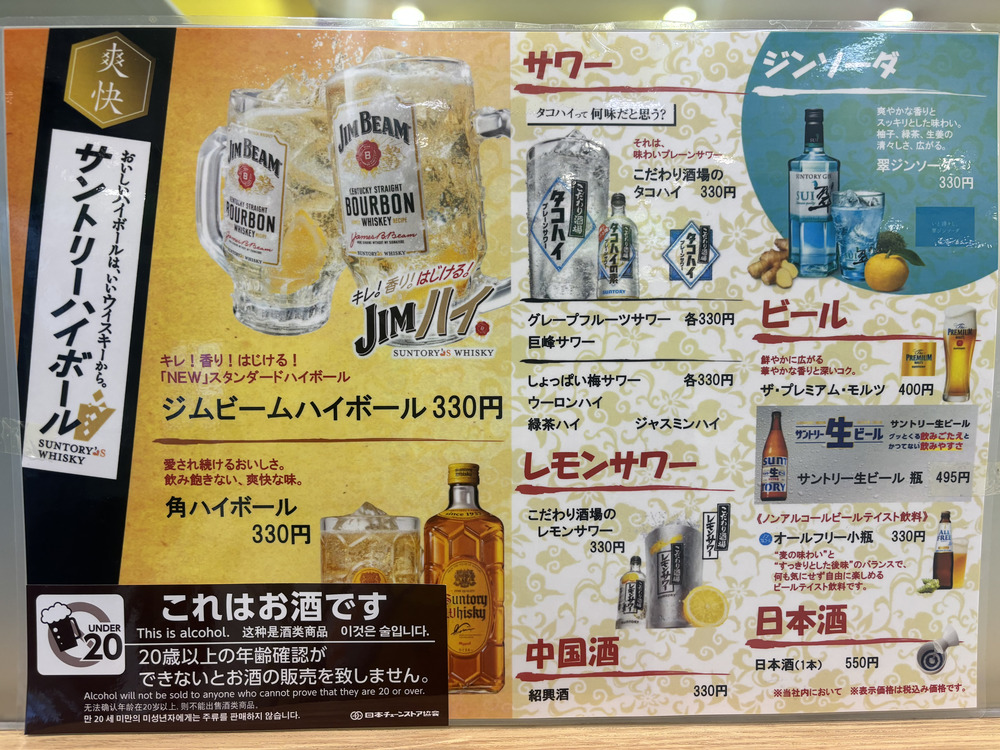 大唐では、アルコールメニューもそろっています。ビールにハイボール、サワー、日本酒…さらに中華料理にぴったりの紹興酒まで。フードコートにあるお店とは思えない種類の多さです!