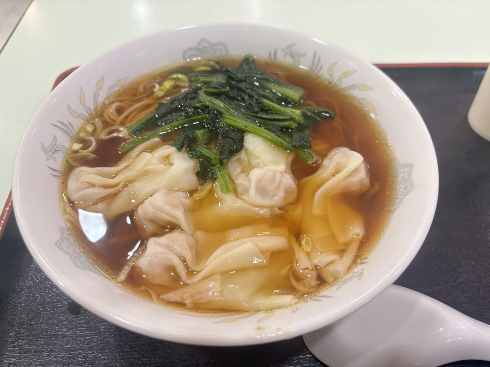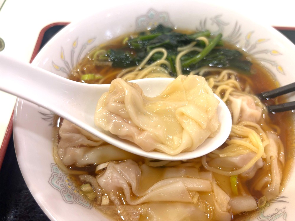 ワンタンはふわふわのやわらかい食感で、口の中で優しくとろけます。中に包まれたエビはしっかりとした味付けで、ワンタンと一緒に食べることで程よい風味に。