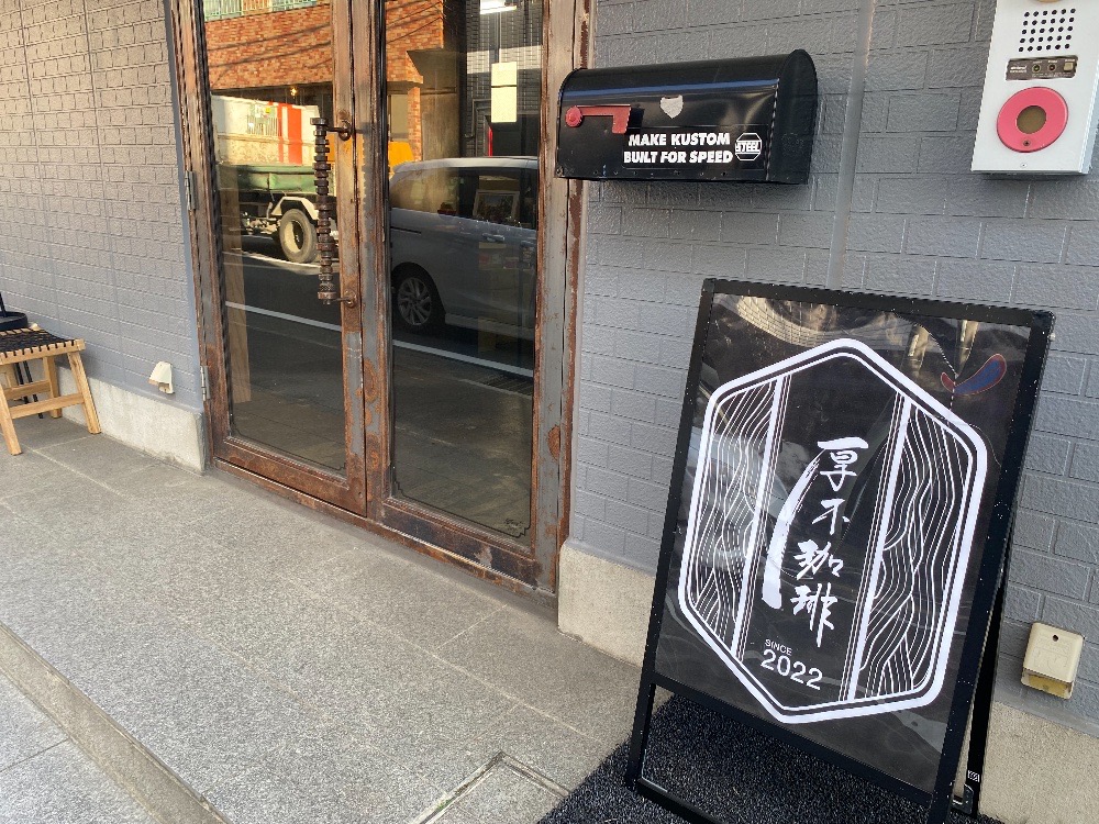 お店の入口には、厚木珈琲と書かれた黒い看板が置かれています。