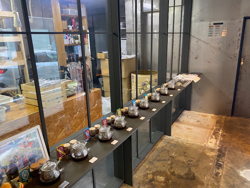 大きな窓の手前には、たくさんの種類のコーヒーが並んでいます。