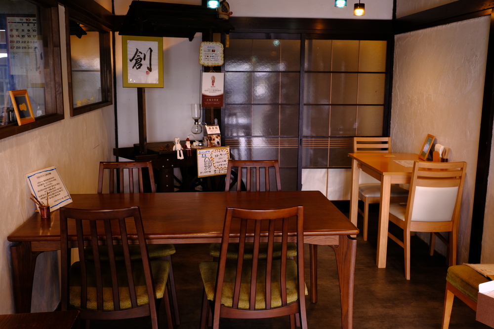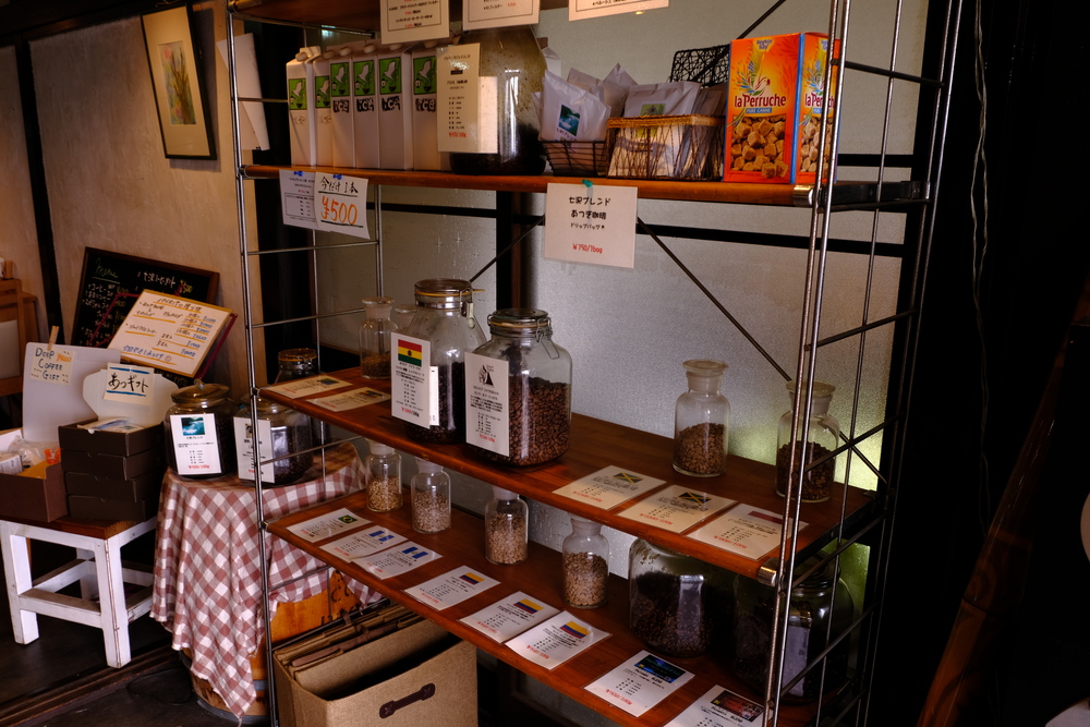 右手側には、オーナーさんが選んだコーヒー豆やお菓子、グッズなどが販売され、カフェスペースが設けられています。