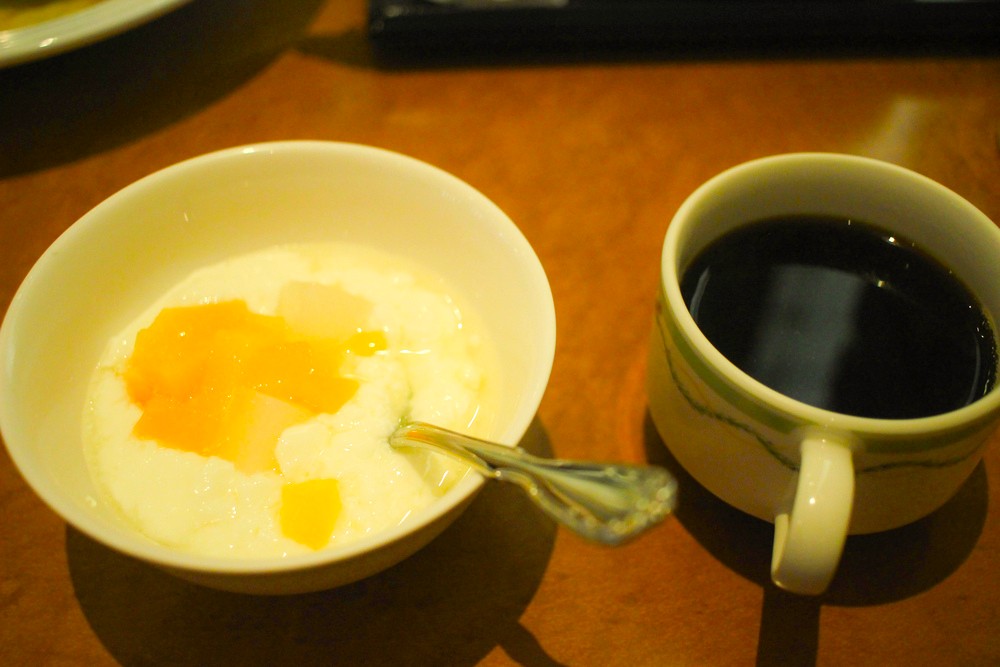 サラダバーには、デザートのヨーグルトとフルーツもあります。さっぱりとしたヨーグルトと、苦みの効いたコーヒーは、辛いカレーのあとにぴったりです。