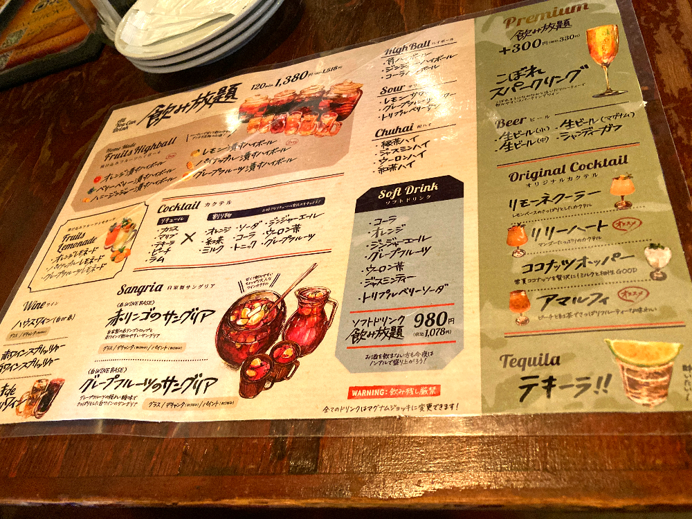 ビール、サワー、カクテル、ワイン、ハイボール、酎ハイ、サングリア、スパークリングワイン、テキーラなどなど…。