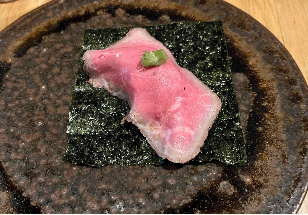 前菜とハムの盛り合わせの次に来たのは、ローストビーフの肉寿司。