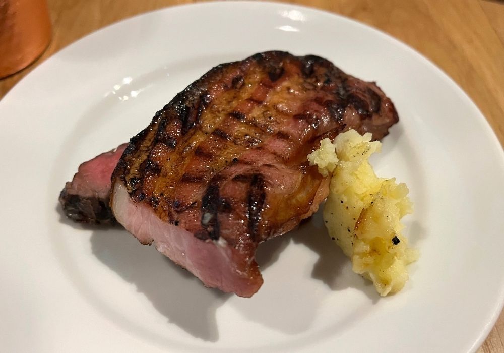 赤身のステーキ肉と厚切りベーコン、マッシュポテトが一皿に盛られています。
