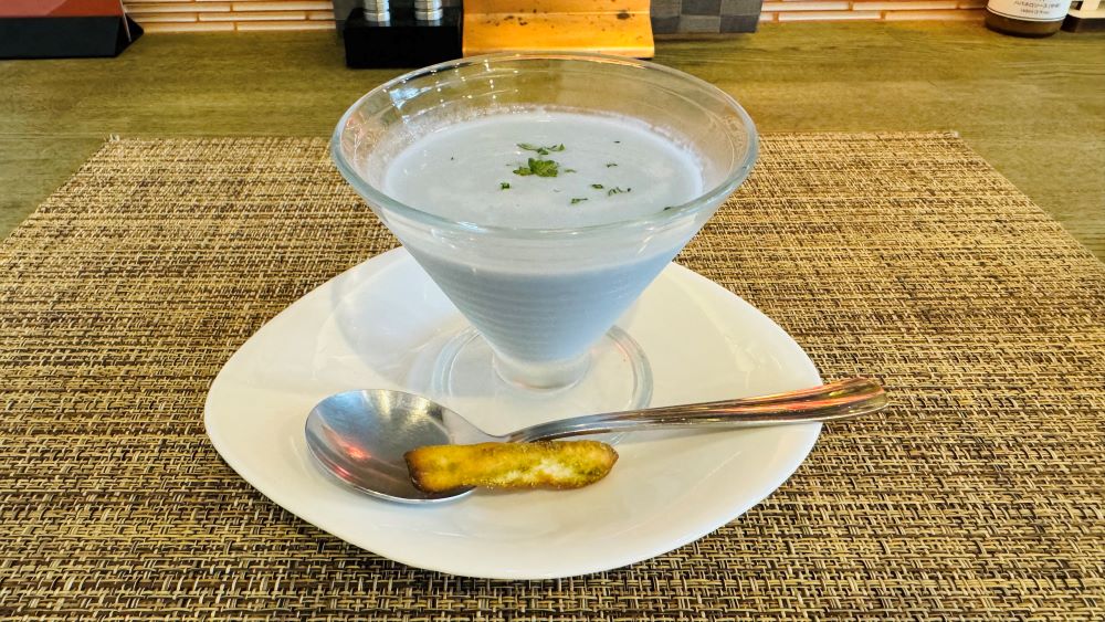 こちらはスープ。この日は千葉県産の紫色のジャガイモ「シャドークイーン」を使ったなめらかなビシソワーズでした。