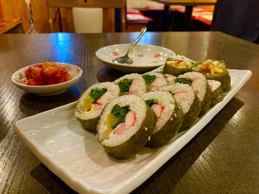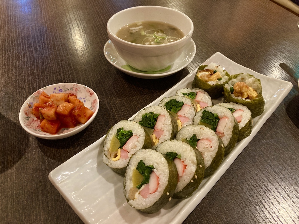 今回頼んだのは、韓国の国民的フード「キンパ」です。キムチやスープもついてくるお得な一品です。