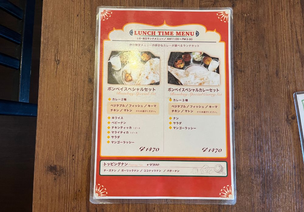 ナンが2種類で半ライスやベビーナンと、チキンがあい盛りされているボンベイスペシャルセットとカレーが3種類でナンがついているボンベイカレースペシャルセット、の2つが土日祝日のランチメニューです。