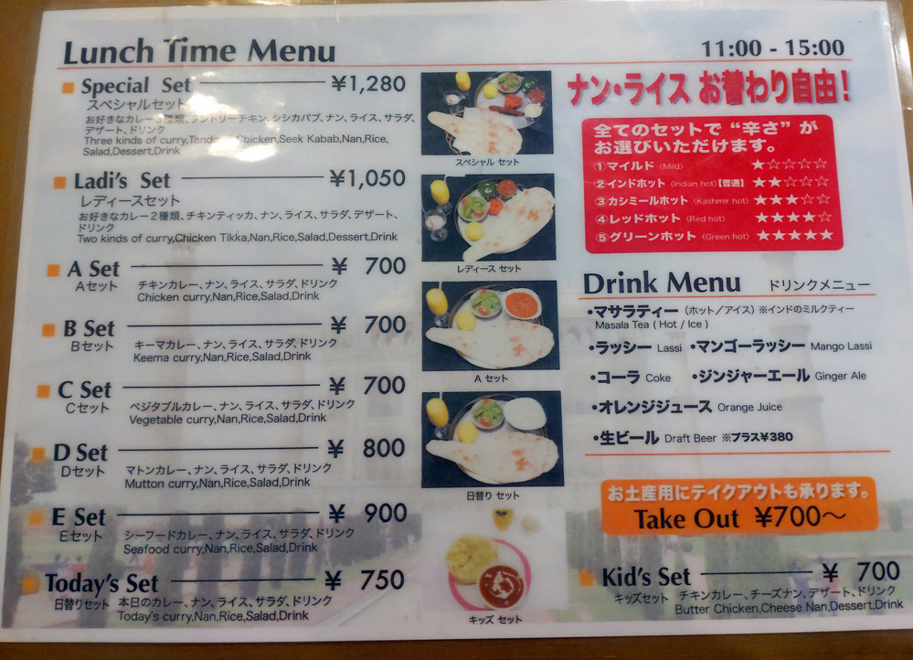 階段横のメニューがすでに気になりますね!どれもおいしそうです。「ナンとライスおかわり自由」も魅力的ですね。