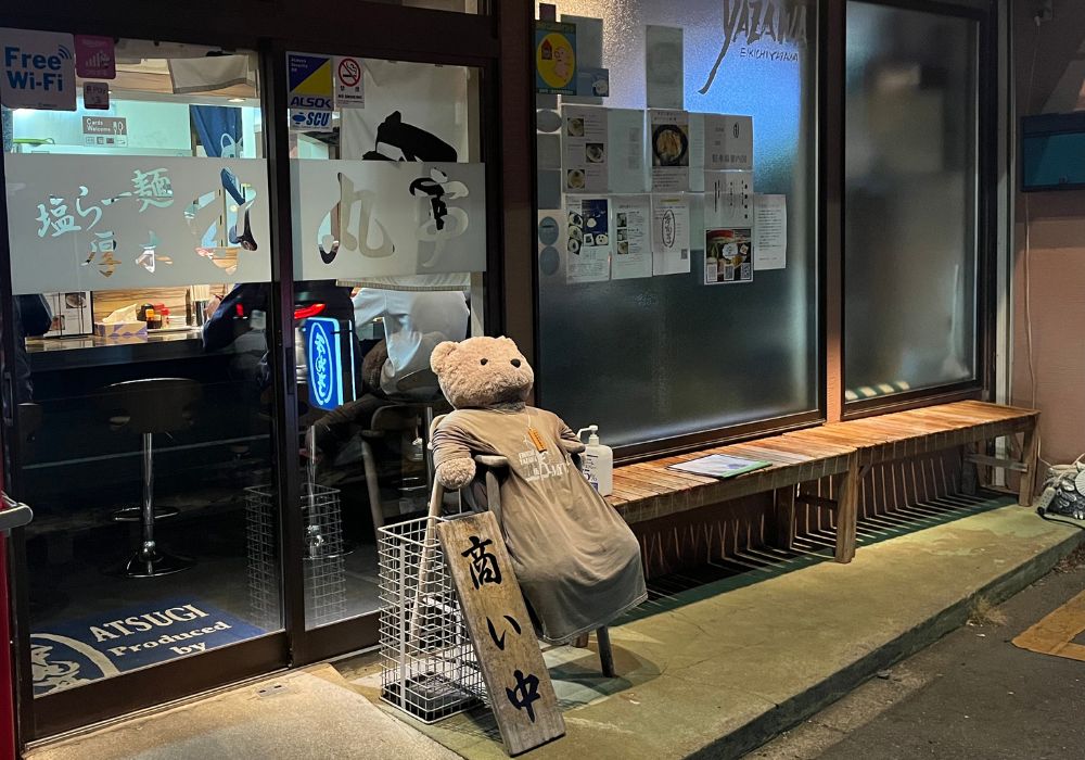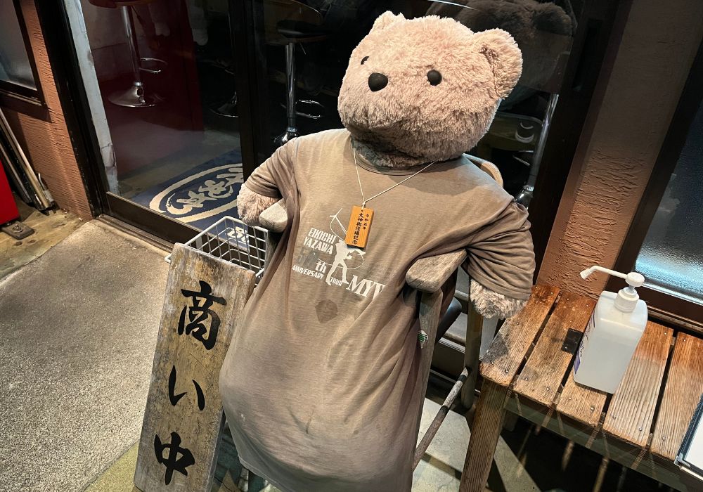 入店待ちをするお客さんのために、ベンチもしっかりと備え付けられています。「商い中」の看板横にいるのは、大きなくまのぬいぐるみ。