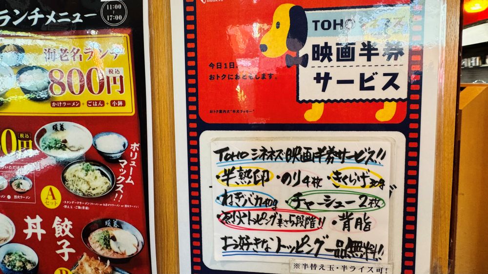 「ラーメン暖暮」は、同じ建物内にある「TOHOシネマズ海老名」と連携したお得なサービスも行っています。
