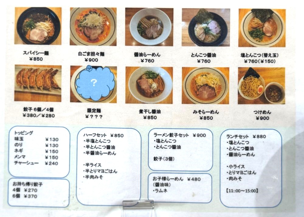 店舗おすすめの塩とんこつラーメンやとんこつ醤油ラーメン、王道の味噌ラーメンや醤油ラーメンをはじめ、白ごま担々麺、つけめん、煮干し醤油ラーメン、スパイシー麺と、さまざまな味が楽しめます。