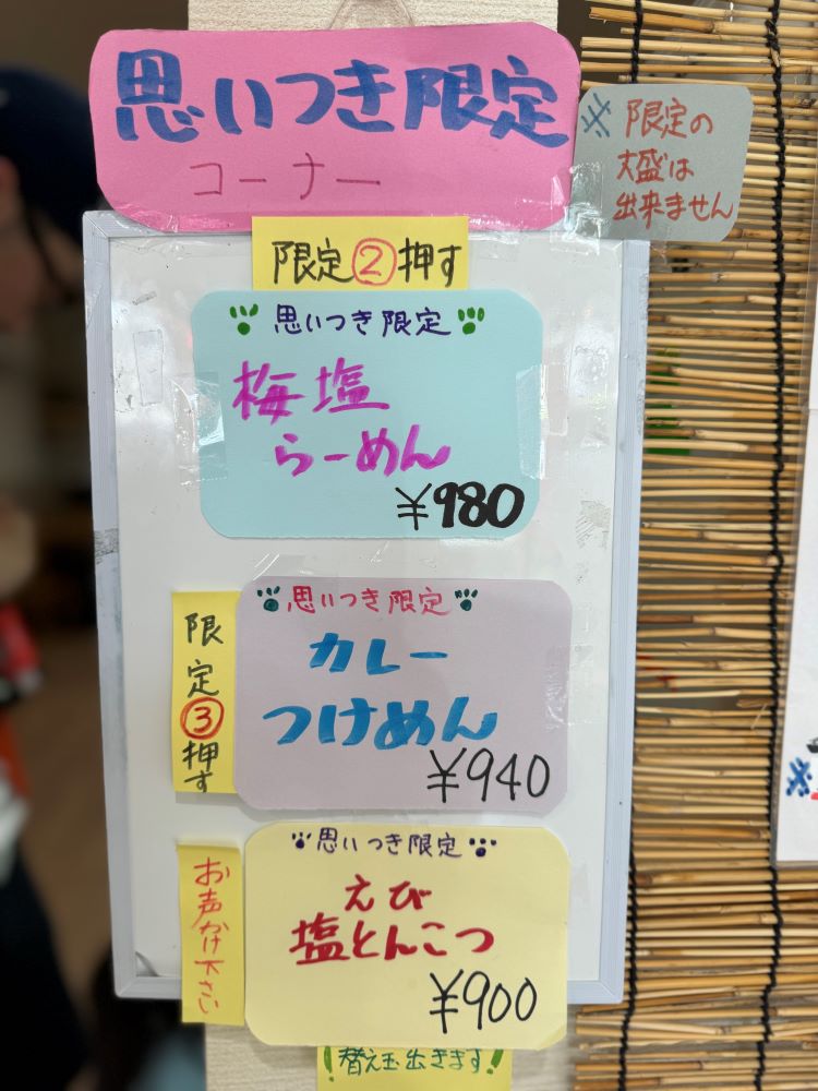 この時の限定メニューには、梅塩ラーメン、カレーつけめん、えび塩とんこつがありました。どれを食べるかついつい食券機の前で迷ってしまいます。