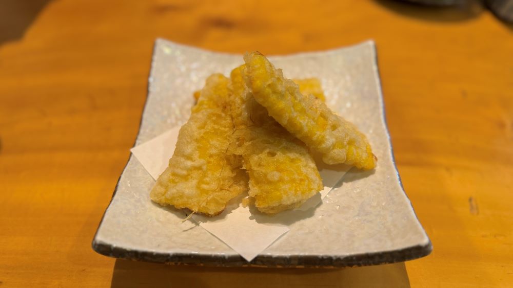 また、とうもろこしの天ぷらもあり、サクサクの衣とプチプチの食感がクセになるおいしさです。