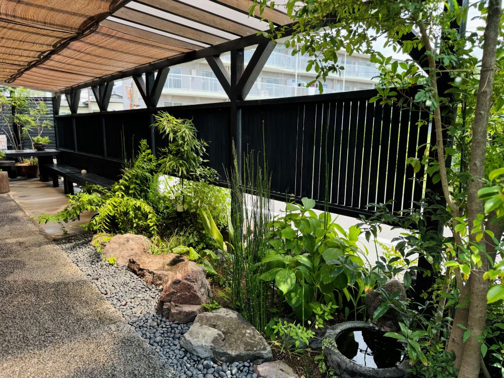 待合室の雰囲気も風情があり、居心地がとても良いです。メダカが泳ぎ、季節の花々が咲く癒しの空間となっています。