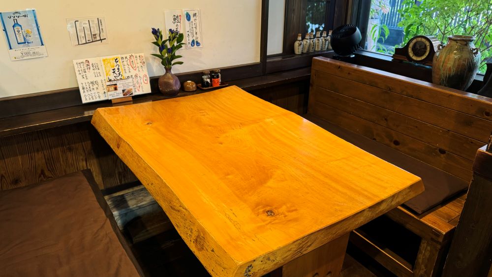 あたたかみのある一枚板のテーブルには、季節ごとに異なる生花が飾られており、おもてなしの心と心配りが感じられます。