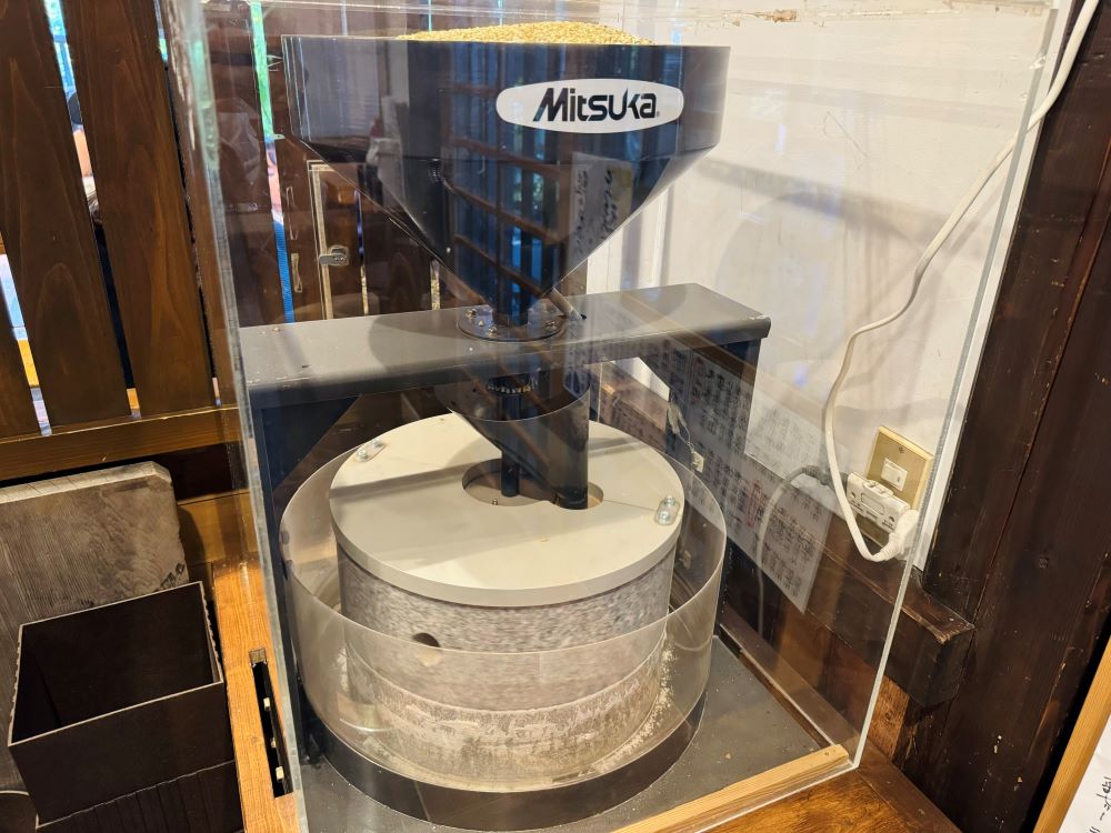 店内に入ると、右手には自動で回る石臼があり、そば粉がサラサラと出てくる様子を見ることができます。