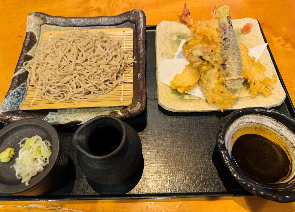プリプリの大きなエビの天ぷらが2本も添えられ、ナスやカボチャなどの揚げたての天ぷらも楽しめます。サクサクとした衣がそばとよく合い、満足感たっぷりです。