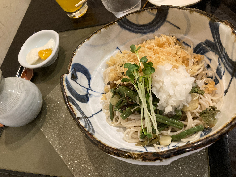 喉越しの良いそばの上に、山菜、天かす、大根おろし、かいわれ大根などがトッピングされていて、お野菜も一緒に採れる一品となっています。