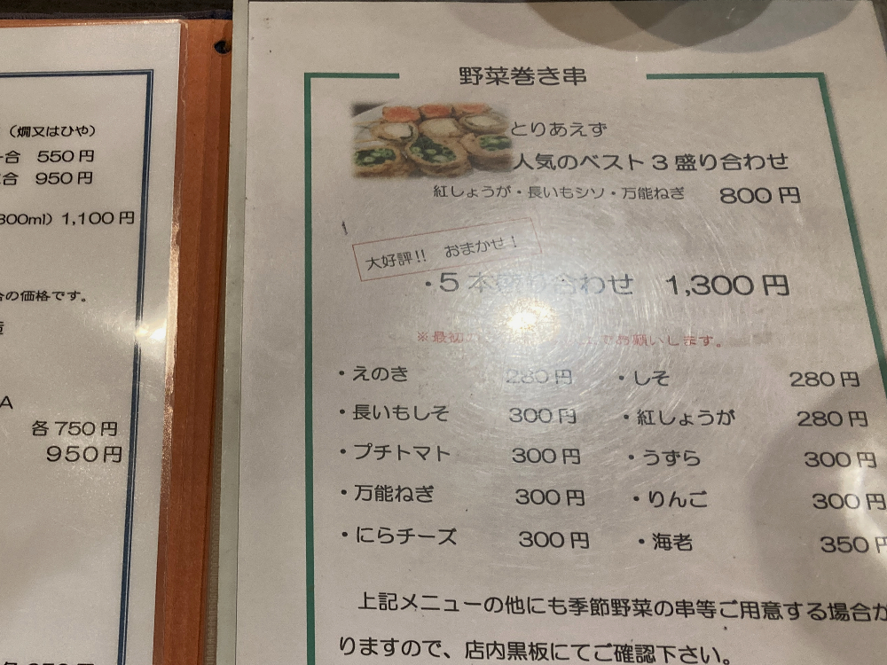 こちらは、夜限定のメニューとして提供されている野菜巻き串です。