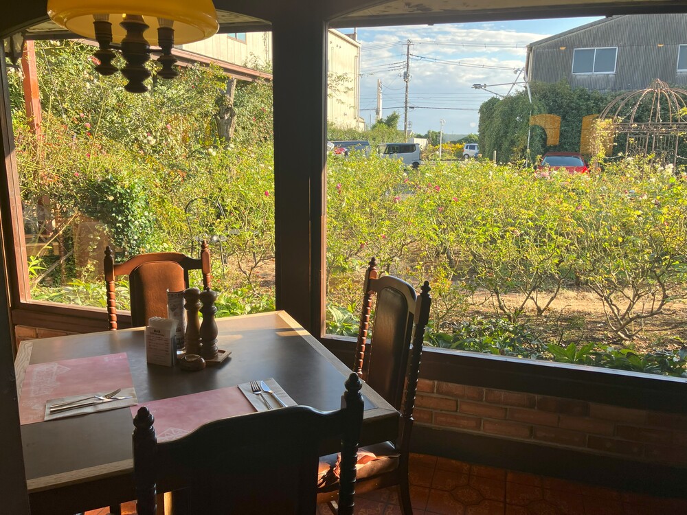 窓際の席に座ると、開放的なガラス窓のすぐそこはローズガーデンで、かわいらしい秋バラが手に取るように見えます。