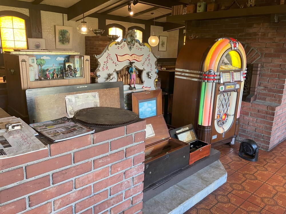 店内の中心には、大小さまざまなアンティークのオルゴールやジュークBOXが展示してあり、不定期でおこなわれるオルゴール演奏を楽しむことができます。