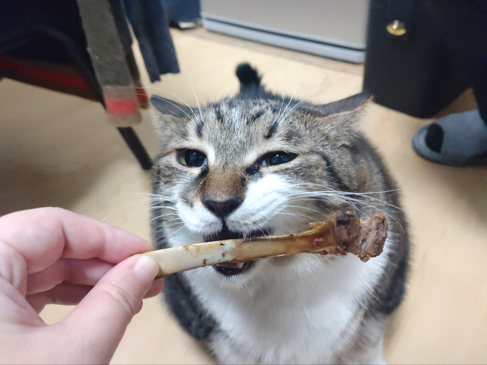骨を見せると、最初は様子をうかがうようににおいをかいでいましたが……「これはおいしいにおいがする!」と、がぶっとかじりついてきました!