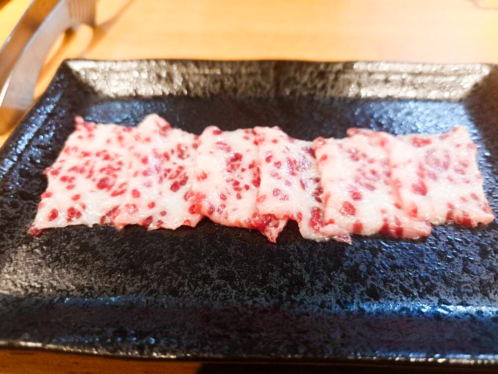 実は「鹿の子」といって、クジラのあごの部分の肉なんです。こちらはにんにく醤油でいただきます。