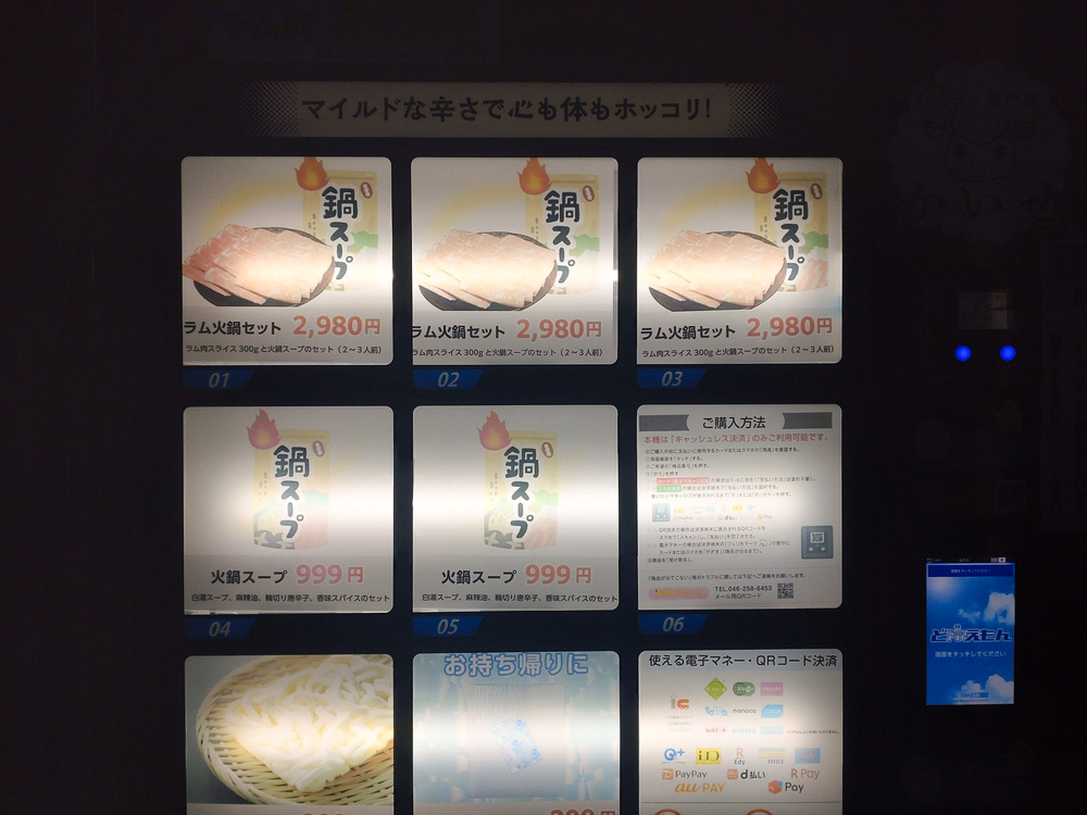かいせは店舗営業だけでなく、自動販売機でもラムしゃぶや犬用おやつを販売しています。ラム火鍋セットは、2〜3人前で2980円ととてもお得。