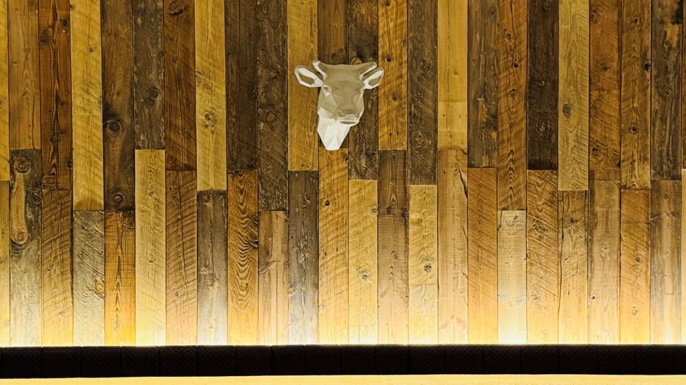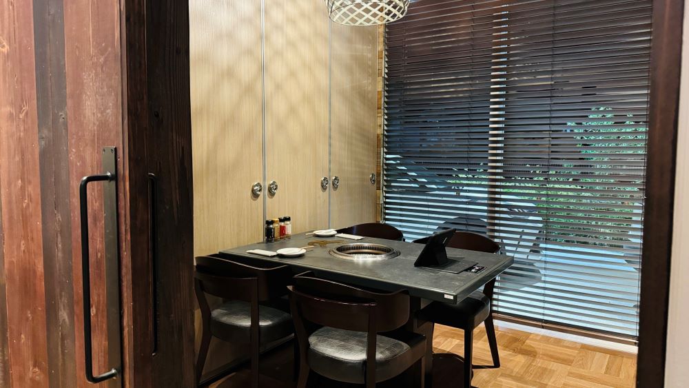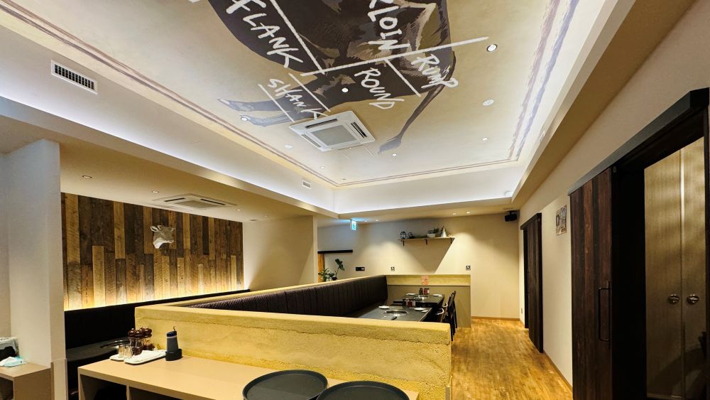 「焼肉ほりにし」の店内は、木の温もりと石の質感を生かしたナチュラルでモダンなデザイン。