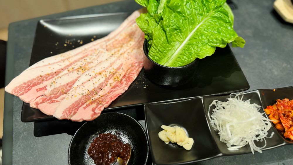 にんにくやネギなどの薬味を豚肉とともにサンチュで巻けば、さまざまな味が絶妙なバランスで広がります。