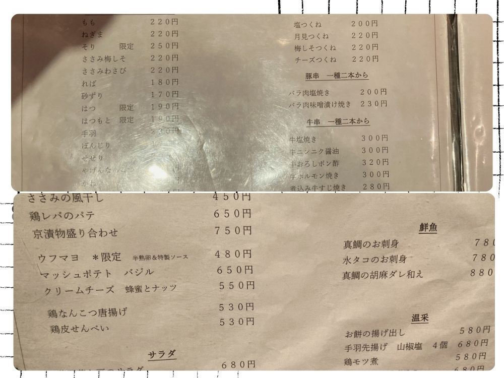 メニューを眺めると、串焼きはもちろんのこと、鮮魚、サラダ、串揚げ、おつまみ、ごはんものなど、どれもおいしそうで選ぶのに迷ってしまうほど豊富です。