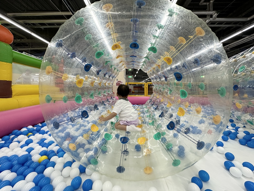 次に息子が挑戦したのは、筒状のバルーン内でハムスターのようにぐるぐる回るエア遊具。日常では体験できない360°の回転遊びに息子も大興奮。「回る、回る!」と楽しそうに何度も転がりながら汗だくになっていました。