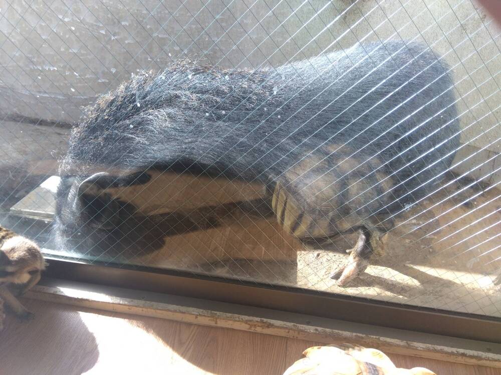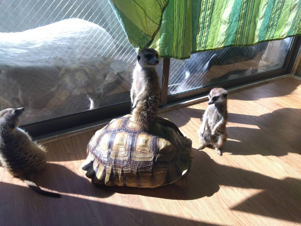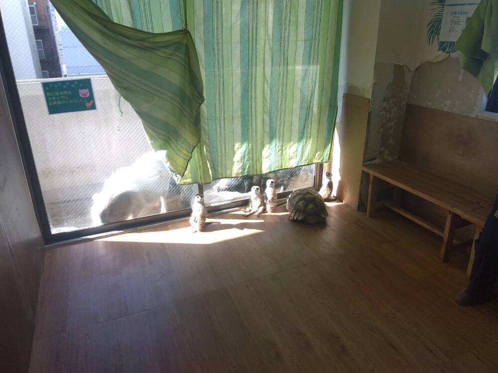 窓際でひなたぼっこをするミーアキャットと亀。奥のベランダではブタが二頭いましたが、残念ながら現在ふれあいは中止しているとのことです。