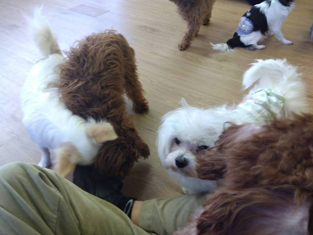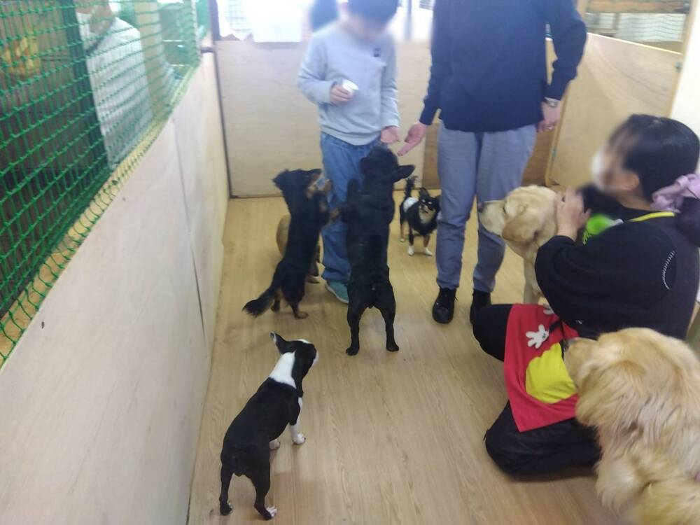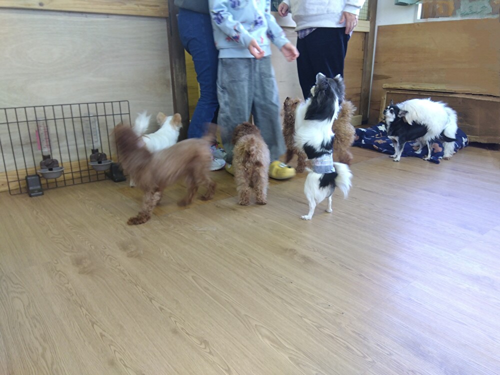 何もせず床に座っているだけでもぞくぞくと近づいてくるワンちゃんたち。靴の素材がよほど気になったのでしょうか。とはいえ、数多くの動物に囲まれるというのは夢の話だと思ってました。