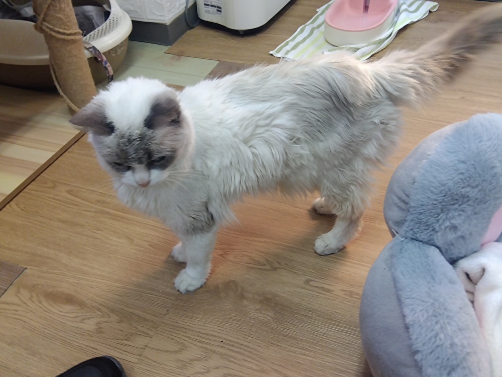 眠たそうな目つきをしながらも真っ先に私の方へ近づいてくれた子です。こう見えて結構な甘えん坊でニャーニャー泣きながら足元をスリスリとしてきます。かわいい!