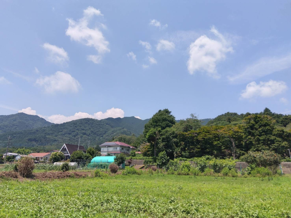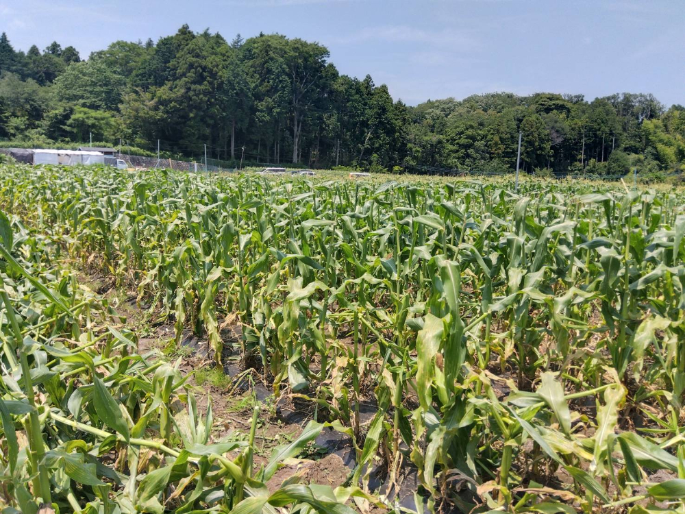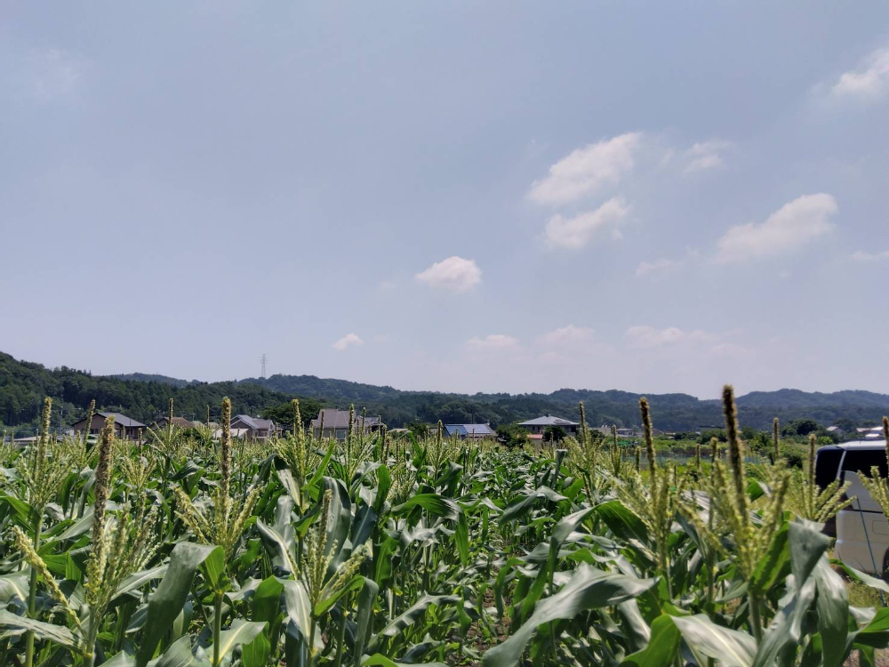 目の前に広大なトウモロコシ畑、奥には里山と青空が広がる自然豊かな風景が広がっています。
