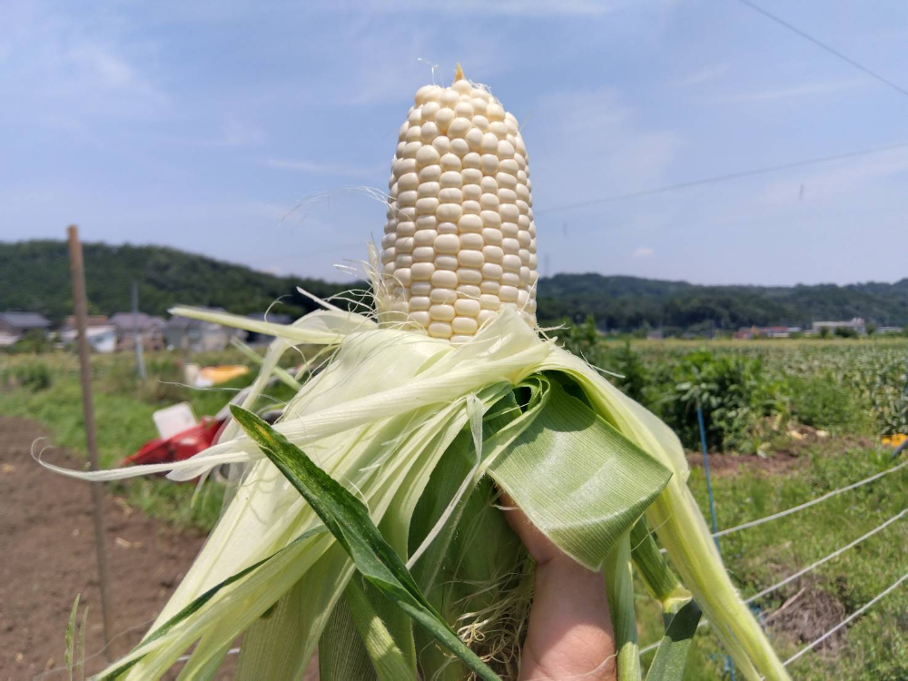 今回収穫したとうもろこしは、ホワイトコーン「白い恵み」。栽培の難しさから流通量の少ないレアな品種を味わうことができました。